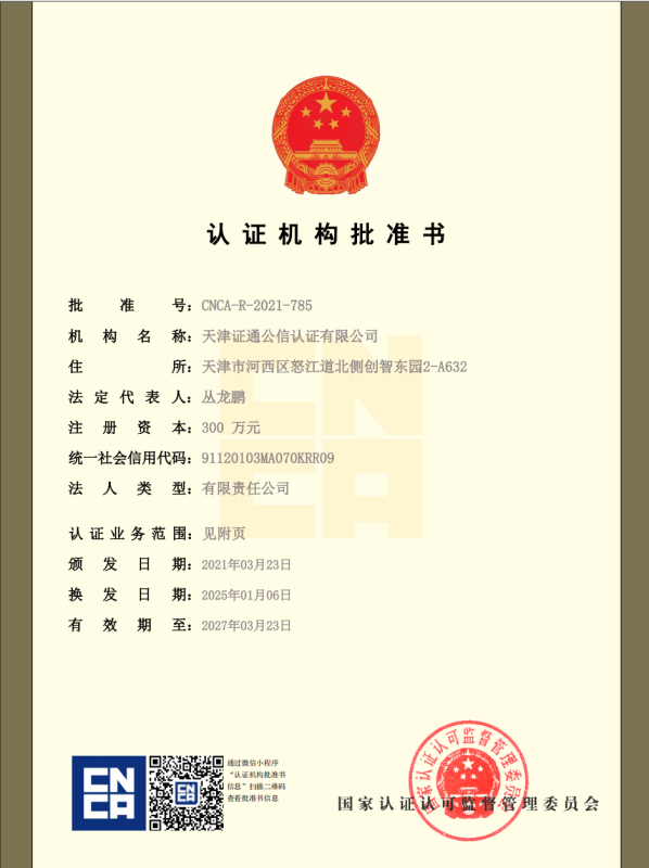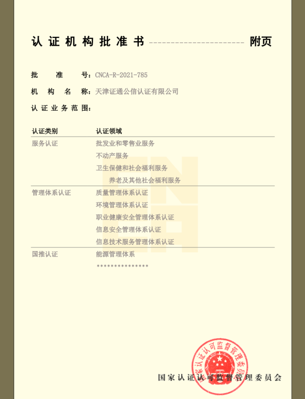 ZTC在国家认证认可监督管理委员会批准的从业领域内,能够开展质量管理体系认证(ISO9001)、工程建设施工企业质量管理体系认证(GB/T50430)、环境管理体系认证(ISO14001)、职业健康安全管理体系认证(ISO45001)、能源管理体系认证(ISO50001)、信息安全管理体系认证(ISO/IEC 27001)、HSE管理体系认证、能源管理体系认证(GB/T23331)、企业诚信管理体系认证(GB/T 31950)、社会责任 管理体系( GB/T39604)等管理体系认证业务及售后服务认证(GB/T 27922)、物业服务认证(GB/T 20647.9)、养老服务认证(RB/T 303)等服务认证业务。